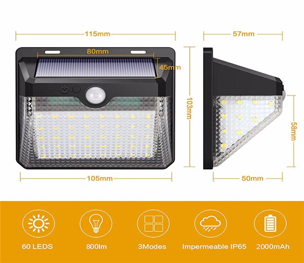 ☀【Solar lights with 3 Intelligent Modes】Charge during the day,the 60 LED Solar Lights have 3 Modes for your choice: Motion sensor + 30% low light, Motion sensor mode, Continuous light mode. The updated PIR motion sensor detects people as far away as 10-16 feet,the angle of movement is 180º,Meet your different demands.