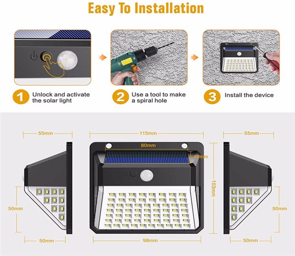 【ECO-FRIENDLY SOLAR POEWRED LIGHTS】Built-in 2000mAh rechargeable lithium-ion battery, no complicated cable, this motion sensor light can be fully charged efficiently and quickly by solar panel under direct sunlight for 8 hours, energy-saving and eco-friendly. Yacikos 82 LEDs light provides you the super bright illumination for your garden, courtyard, stairs, driveway, patio and etc