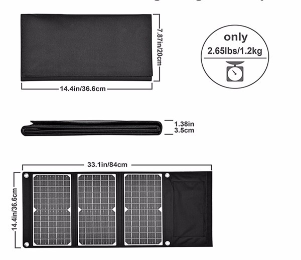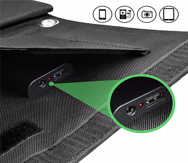 Material: PET monocrystalline solar panel/polyester waterproof fabric/intelligent charging chip.