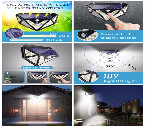 【Super bright LED solar light outdoor】 Solar lights outdoor with 109 LED, 270 ° lighting angle and updated PIR motion sensor transforms dark room into a well-lit area. The precision motion sensor has a detection range of 120 ° and the detection distance is 3-5 meters. Solar lights provide brightness, comfort and security for your patio, garage, garden, street, etc. Brighter than other similar LED solar lights on the market