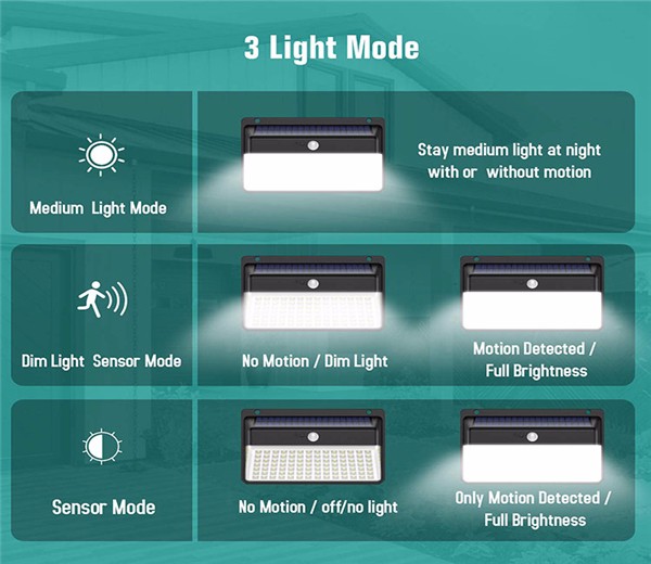 ☀【Super Bright 118 LED with 3 Modes】The 2019 upgraded 118 LED solar lights come with 3 intelligent modes: ① Strong light sensor mode. ② Dim light sensor mode. ③ Continuous slight light mode. Designed with 118 super bright led beads, Yacikos solar lights are brighter than other similar lights. Besides, the accurate180°PIR sensor can detect motion as far away as 10-26ft with wider 270° Illumination, more sensitive and meet your different demands