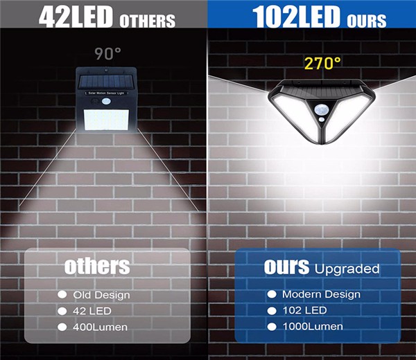 【Brighter and Wider Lighting Solar Lamp】Equipped with upgraded high power 102 LEDs newest energy management chip, light is much brighter than other solar lights. 270° Four-sided wide-angle increases the angle and area of illumination by 50%. Great for patio, yard, garage, deck, pathway etc. Note: Please press the switch button for 5 seconds to turn on before use.