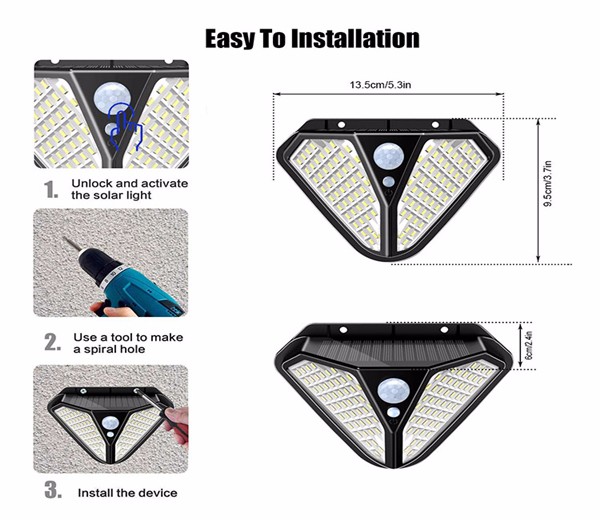 【Installing the Solar Light】 You can easily install the solar light motion sensor on the wall with enclosed screws. Please install the solar lights in the direction of sunlight to get a better charge. The recommended installation height is about 2 to 3 meters.perfekt suitable for outdoor use, such as balconies, terraces, stairs, gardens, exterior walls